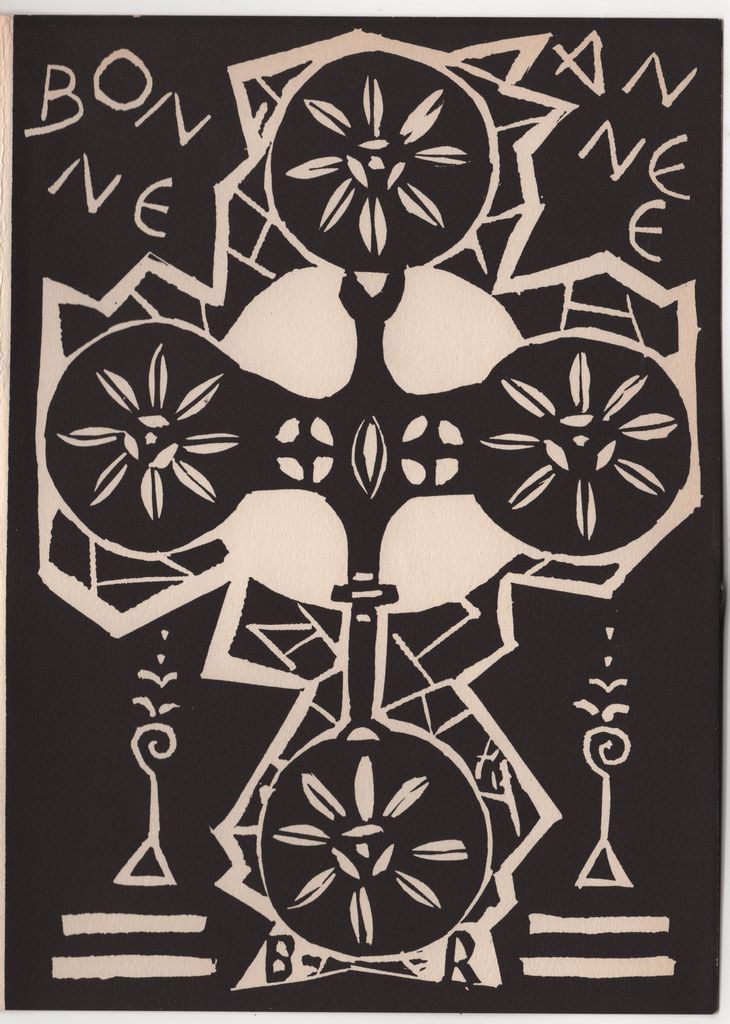 Κάρτα, στα γαλλικά, δίπτυχο, χαρτόνι, 21,5×15,5 εκ. Αναπαραγωγή έργου της Μπέλλας Ραφτοπούλου σε πρωτοχρονιάτικη κάρτα.