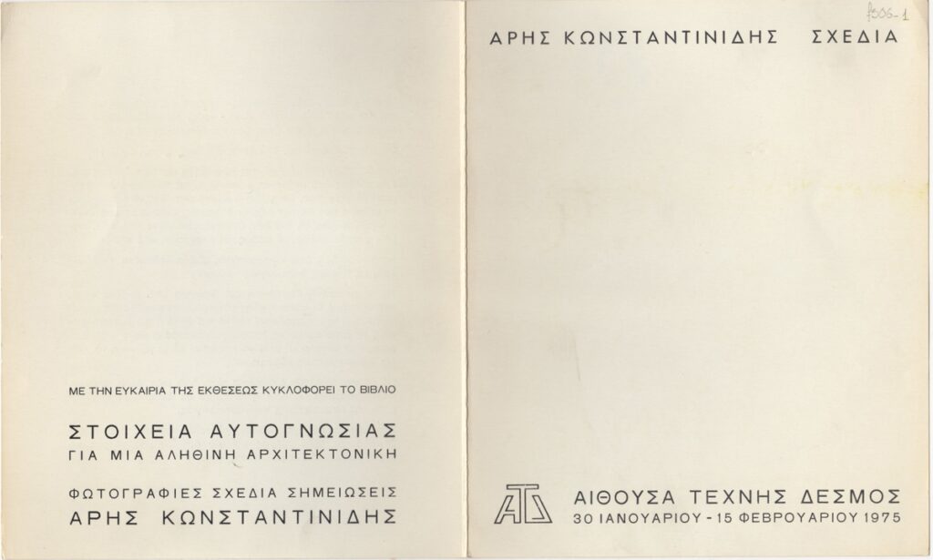 Έντυπο, χαρτόνι αναδιπλωμένο, 18,5×15,5 εκ., στα ελληνικά, ατομικής έκθεσης σχεδίου του Άρη Κωνσταντινίδη. Περιέχει κείμενο για τον καλλιτέχνη και το έργο του από τον Κλέαρχο Λουκόπουλο. Σημειώνεται πως στο πλαίσιο της έκθεσης κυκλοφορεί το βιβλίο του με τίτλο “Στοιχεία Αυτογνωσίας για μια αληθινή Αρχιτεκτονική”.