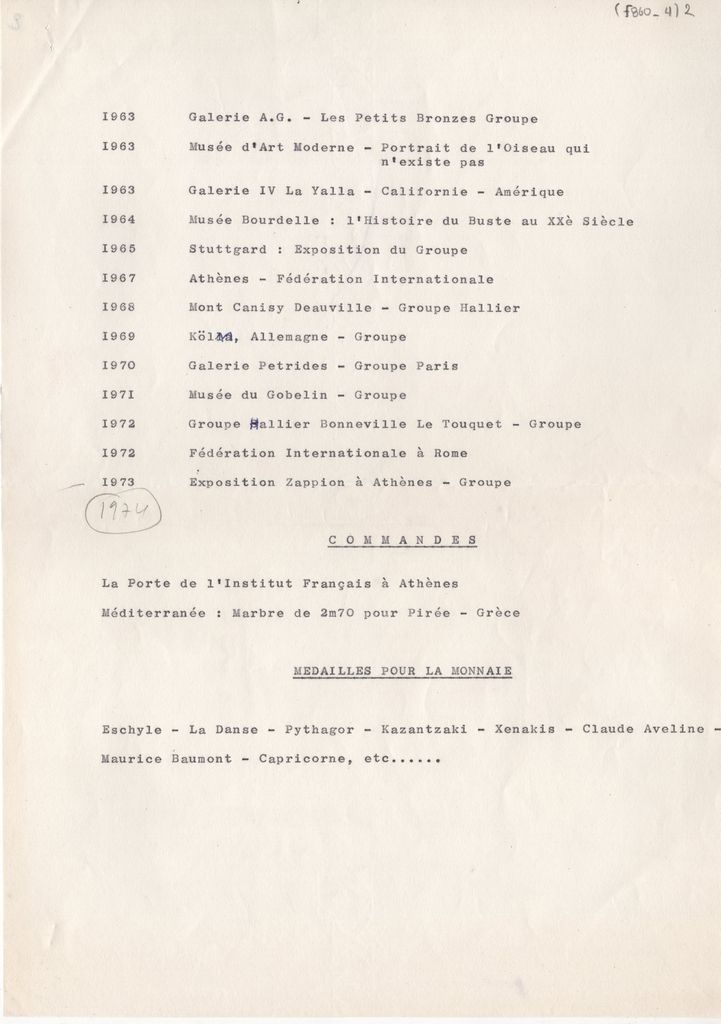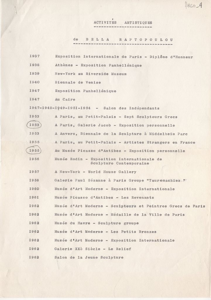 Κείμενο, δακτυλόγραφο, στα γαλλικά, χαρτί, 2 φφ., 29,8×21,0 εκ. Χρονολόγιο εκθέσεων της Μπέλας Ραπτοπούλου. Καλύπτει την περίοδο 1937-1973