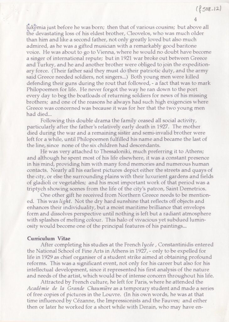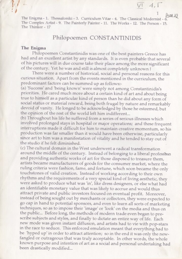 Έντυπο, χαρτί, 22 φφ, 30×21 εκ., στα αγγλικά, με κείμενο για τη ζωή και το έργο του Φοιλοποίμονα Κωνσταντινίδη.