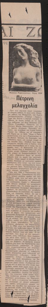 Απόκομμα, έντυπο, χαρτί, 41,7×6,2 εκ., όπου δημοσιεύεται, στα ελληνικά, άρθρο για το έργο τη γλύπτρια Μπέλλα Ραφτοπούλου με αφορμή την αναδρομική έκθεση έργων της στην Αθήνα το 1980. Επάνω, επιγραφή με τα στοιχεία της δημοσίευσης.