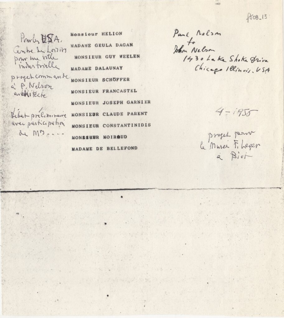 Φωτοαντίγραφο, δακτυλόγραφο και χειρόγραφο, χαρτί, 23,5×21 εκ., στα γαλλικά, λίστα των εμπλεκόμενων στο σχεδιασμό του Μουσείου F. Léger. Ειδικότερα, αναφέρονται τα ονόματα των Hélion, Geula Dagan, Guy Weelen, Dalaynay, Schoffer, Francastel, Joseph Garnier, Claude Parent, Moiroud, De Bellefon, Paul & John Nelson και Κωνσταντινίδη Φιλοποίμονα.