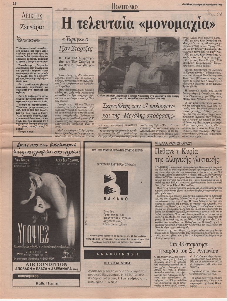 Απόκομμα, έντυπο, χαρτί, 38,0×29,8 εκ., όπου δημοσιεύεται, στα ελληνικά, η είδηση του θανάτου της γλύπτριας Μπέλλας Ραφτοπούλου. Στην ίδια σελίδα, δημοσιεύματα για τον θάνατο του αμερικανού σκηνοθέτη John Sturges και του πεζογράφου Σταύρου Αντωνίου.