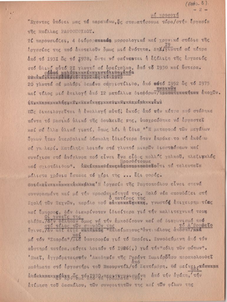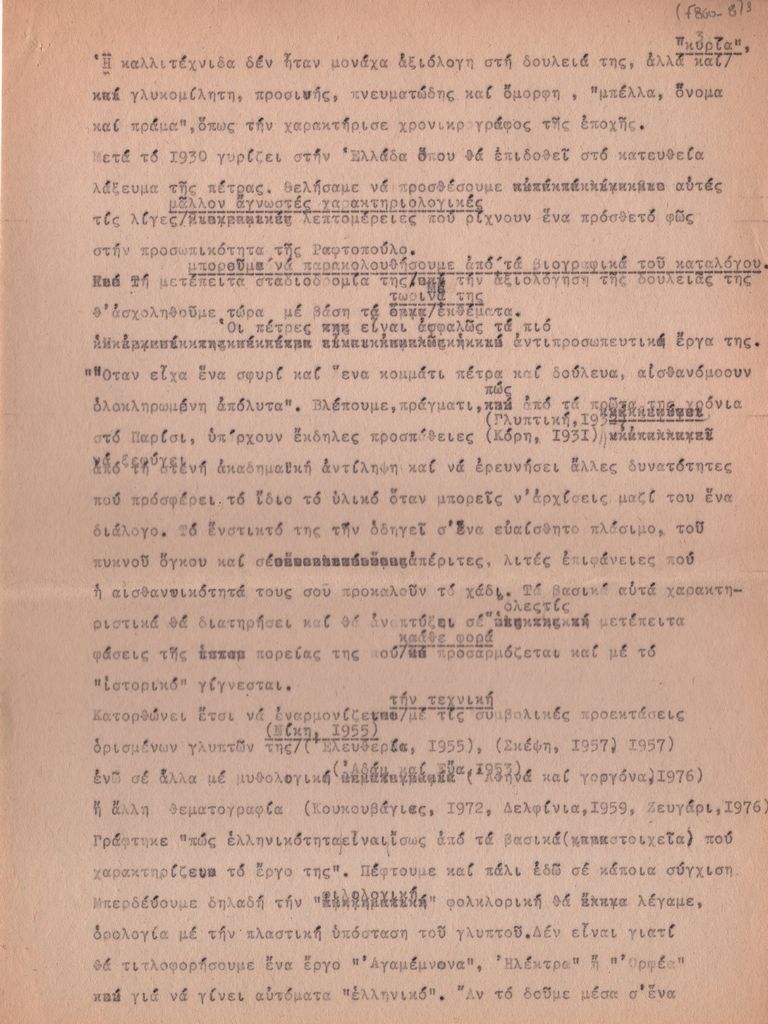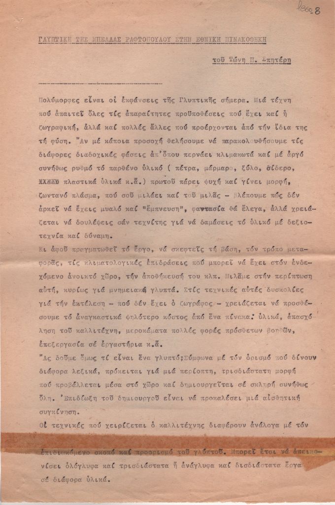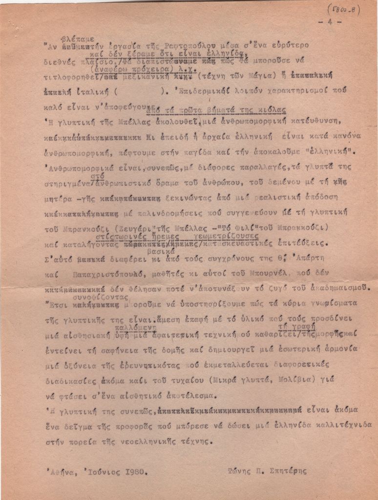 Κείμενο, δακτυλόγραφο, στα ελληνικά, χαρτί, 4 φφ., 31,5×21,3 εκ. Προσχέδιο κειμένου του Τώνη Π. Σπητέρη για το έργο της Μπέλλας Ραφτοπούλου με αφορμή την έκθεσή της στην Εθνική Πινακοθήκη και Μουσείο Αλέξανδρου Σούτζου το 1980.