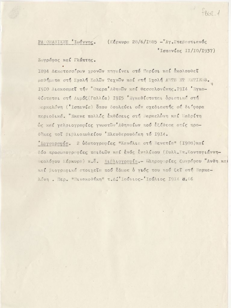 Βιογραφικό, δακτυλόγραφο, χαρτί, 29×21 εκ., στα ελληνικά, του Ιωάννη Ραψομανίκη. Περιέχει σπουδές, εκθέσεις- συμπράξεις, εργογραφία και βιβλιογραφία για τον καλλιτέχνη.