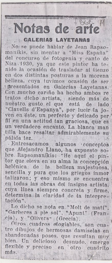 Φωτοαντίγραφο, χαρτί, 13.5×6.5 εκ., στα ισπανικά, δημοσίευσης κριτικής έκθεσης του Ιωάννη Ραψομανίκη, η οποία διεξάγεται στην Βαρκελώνη.