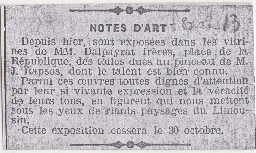 Φωτοαντίγραφο, χαρτί, 3,5×6,5 εκ., στα γαλλικά, δημοσίευσης έκθεσης του Ιωάννη Ραψομανίκη στο Παρίσι.