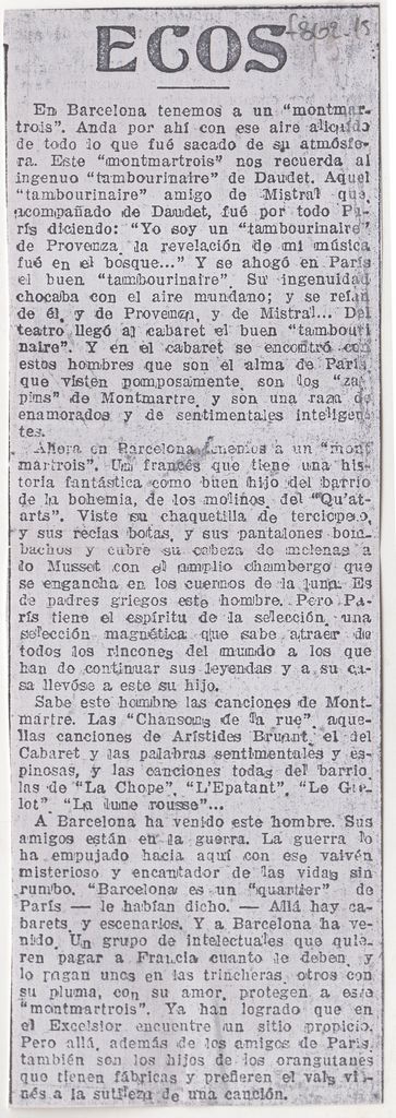 Φωτοαντίγραφο, χαρτί, 18×6 εκ., στα ισπανικά, δημοσίευσης κριτικής έκθεσης του Ιωάννη Ραψομανίκη, η οποία διεξάγεται στην γκαλερί Layetanas στην Βαρκελώνη.