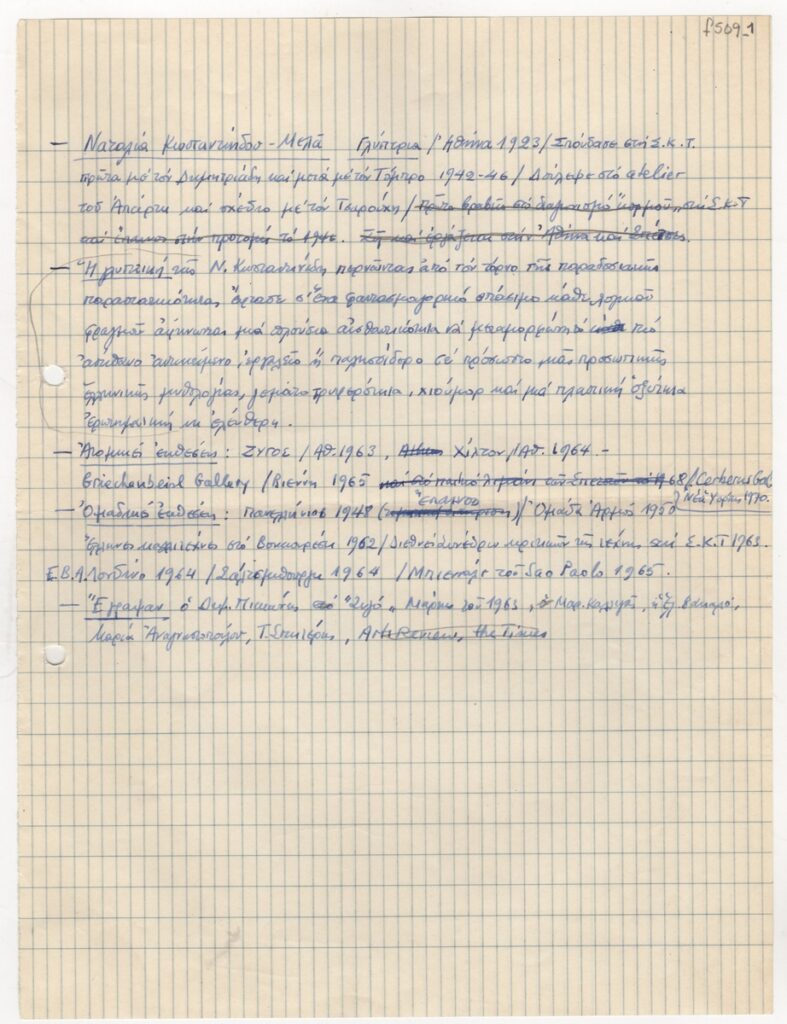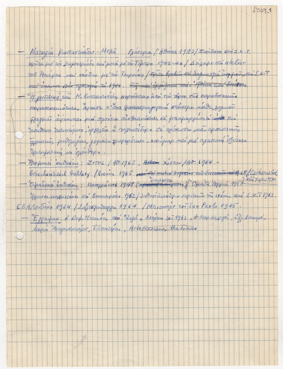 Βιογραφικό, χειρόγραφο, χαρτί, 28,5×21,5 εκ., στα ελληνικά, της Ναταλίας Μελά-Κωνσταντινίδη. Περιέχει σπουδές, κριτική για το έργο της, ατομικές και ομαδικές εκθέσεις.