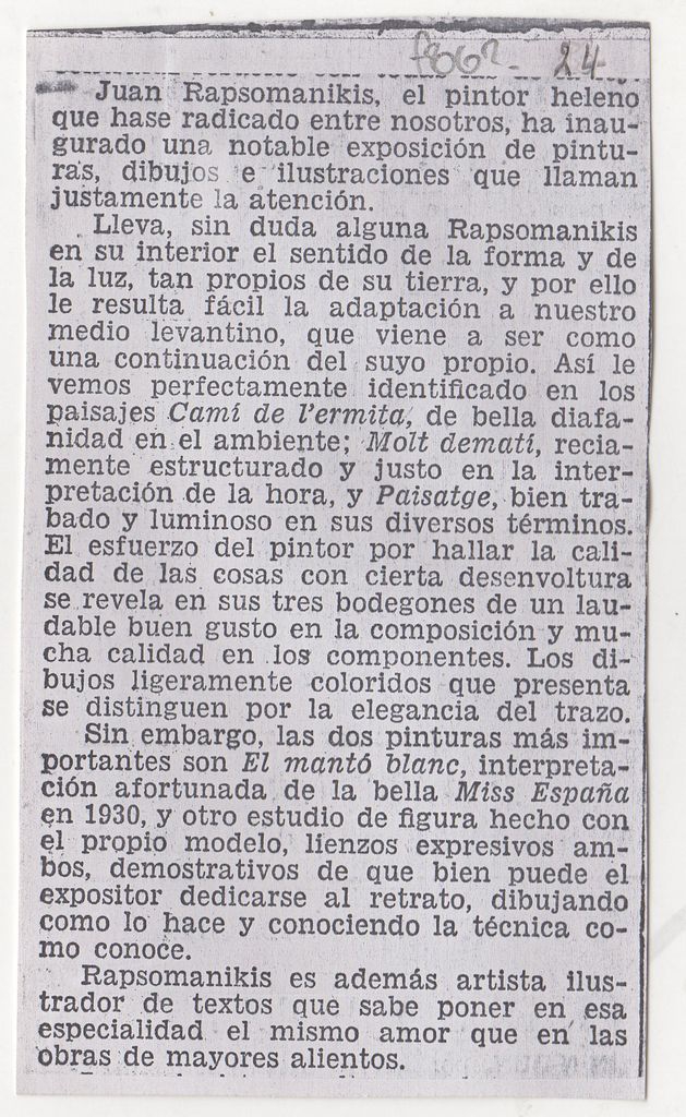 Φωτοαντίγραφο, χαρτί, 11×6 εκ., στα ισπανικά, δημοσίευσης άρθρου αναφερόμενου στο εικαστικό έργο του Ιωάννη Ραψομανίκη.