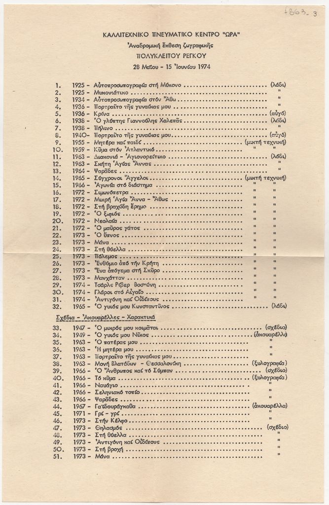 Κατάλογος έργων, χαρτί, 33×22 εκ., στα ελληνικά, έκθεσης του Πολύκλειτου Ρέγκου, η οποία διεξάγεται στο Καλλιτεχνικό Πνευματικό Κέντρο Ώρα.