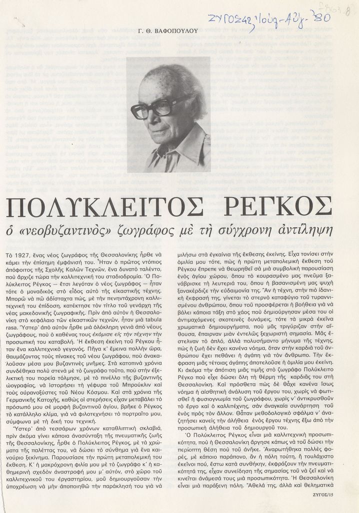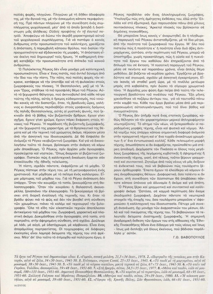 Απόκομμα, χαρτί ιλλουστρασιόν, 2 φφ, 27,5×19,5 εκ., στα ελληνικά, δημοσίευσης κειμένου του Γιώργου Βαφόπουλου για το εικαστικό έργο του Πολύκλειτου Ρέγκου.