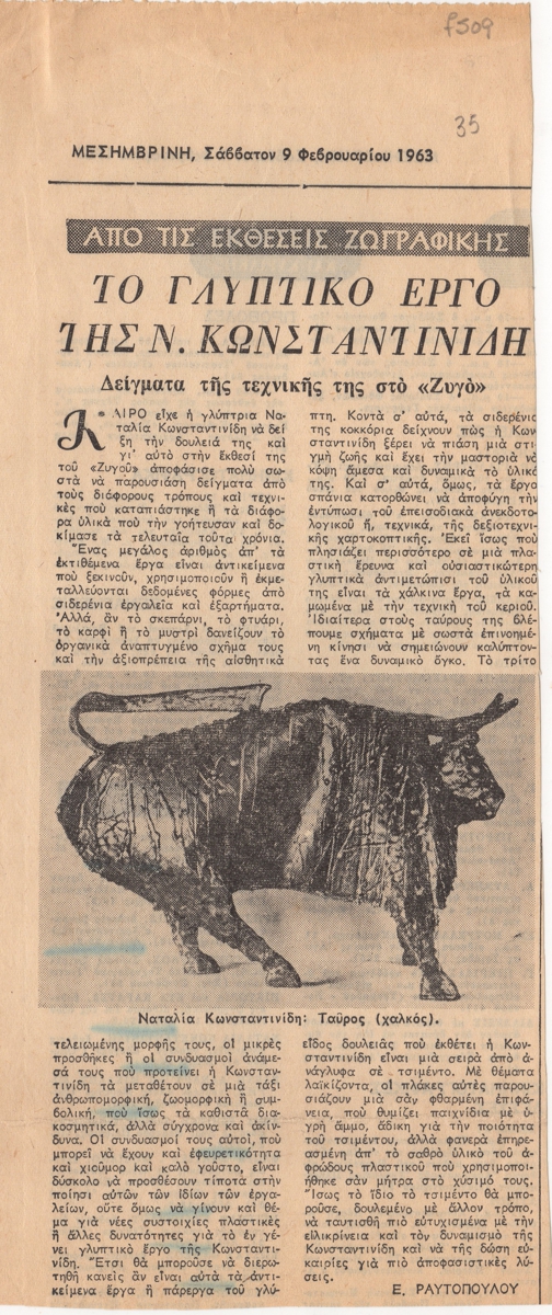 Απόκομμα, χαρτί, 26×11 εκ., στα ελληνικά, δημοσίευσης κριτικής έκθεσης της Ναταλίας Μελά-Κωνσταντινίδη, η οποία διεξάγεται στην Γκαλερί Ζυγός στην Αθήνα.