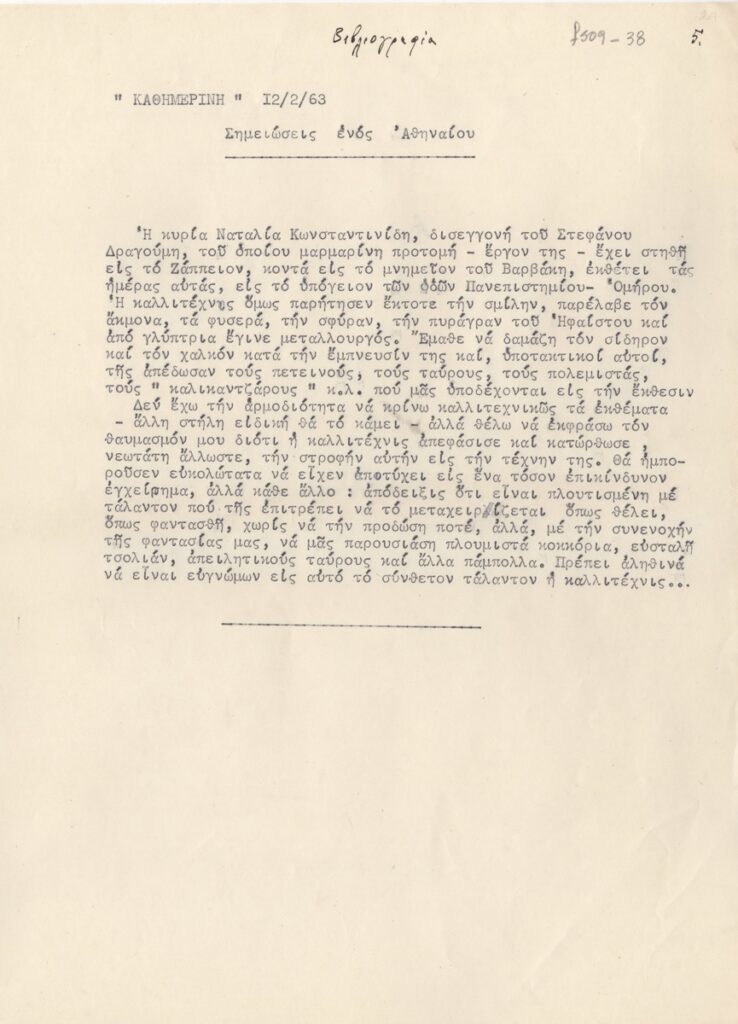 Αποδελτίωση άρθρου για τη ζωή και το έργο της Ναταλίας Μελά Κωνσταντινίδη καθώς και κριτικής έκθεσή της στην Γκαλερί Ζυγός στην Αθήνα (εφημερίδα “Η Καθημερινή”, 12/02/1963).