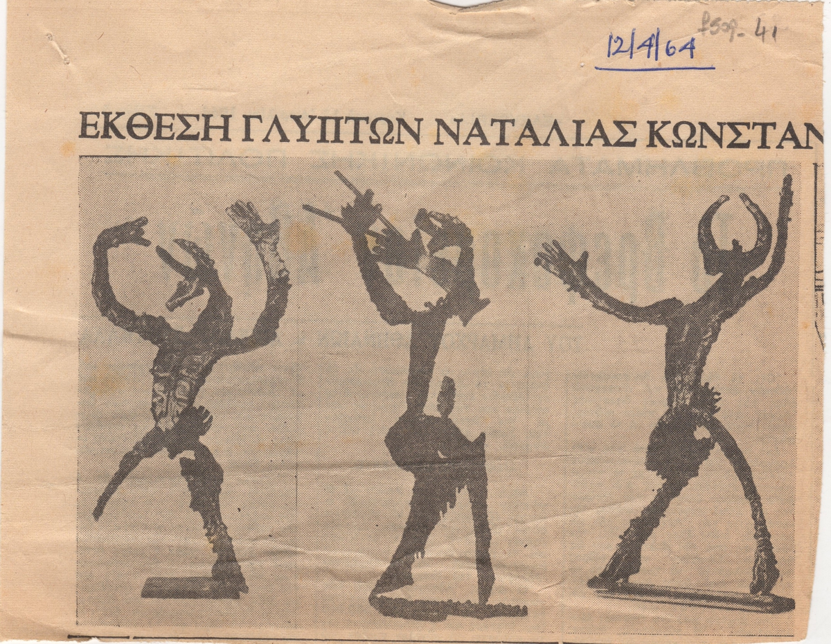 Απόκομμα εφημερίδας (12/04/1964), χαρτί, 2 τμήματα: 13,5×17 και 3×13 εκ., στα ελληνικά. Αναγγελία της ατομικής έκθεσης της Ναταλίας Μελά Κωνσταντινίδη στην Αίθουσα Τέχνης Χίλτον στην Αθήνα.