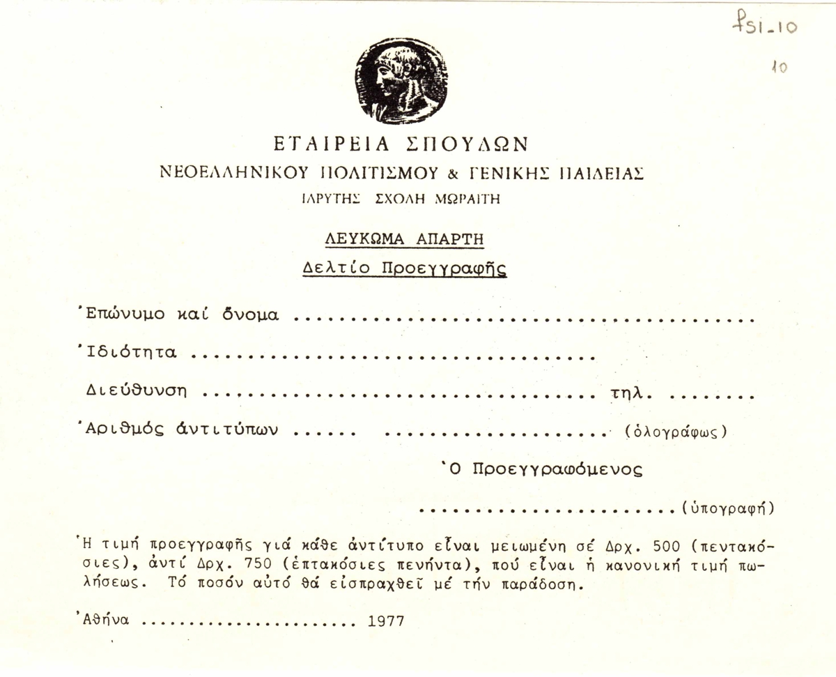 Δελτίο προεγγραφής, χαρτί, 15×19εκ, στα ελληνικά, για την απόκτηση λευκώματος του Θανάση Απάρτη. Στο δελτίο υπάρχουν πεδία για την αναγραφή προσωπικών στοιχείων του ενδιαφερόμενου, καθώς επίσης δίνονται πληροφορίες τιμολόγησης. Το λεύκωμα εκδίδεται από την Εταιρεία Σπουδών Νεοελληνικού Πολιτισμού και Γενικής Παιδείας με ιδρυτή τη Σχολή Μωραϊτη.