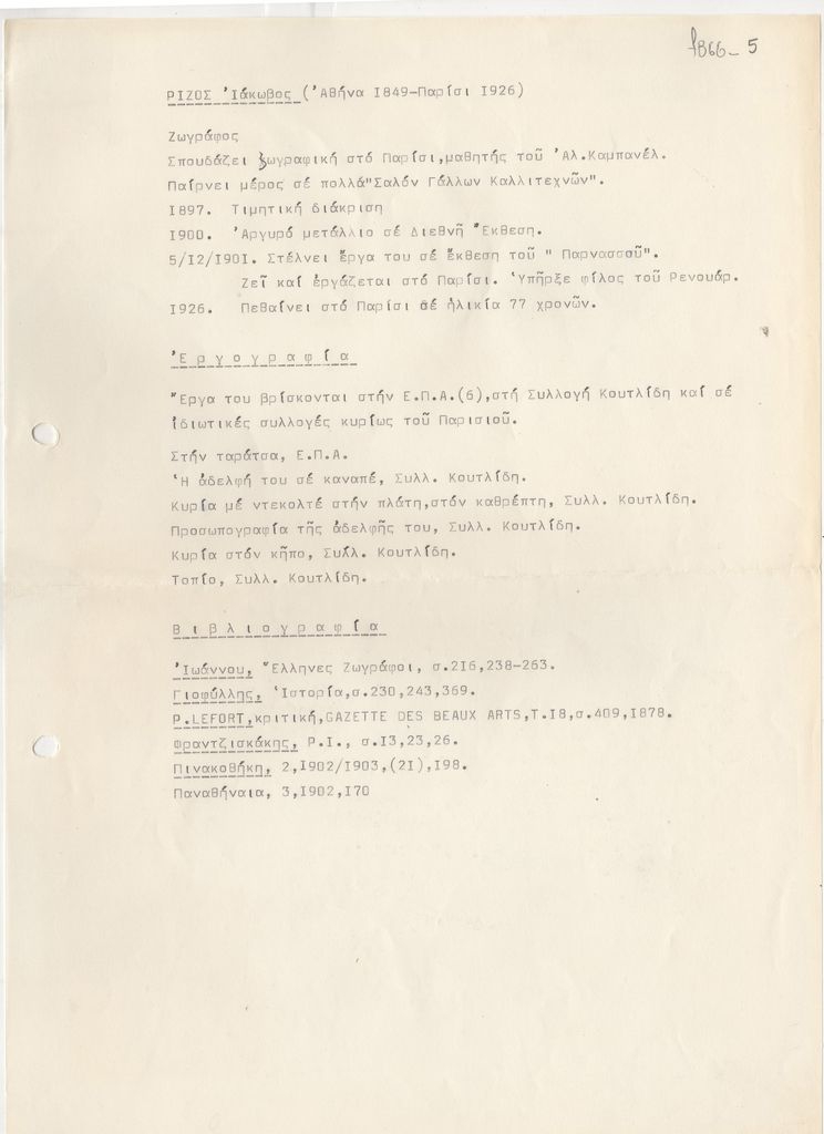 Βιογραφικό, δακτυλόγραφο, χαρτί, 29.5×21 εκ., στα ελληνικά, του Ιάκωβου Ρίζου. Περιέχει σπουδές, μετακινήσεις, εργογραφία και βιβλιογραφία.