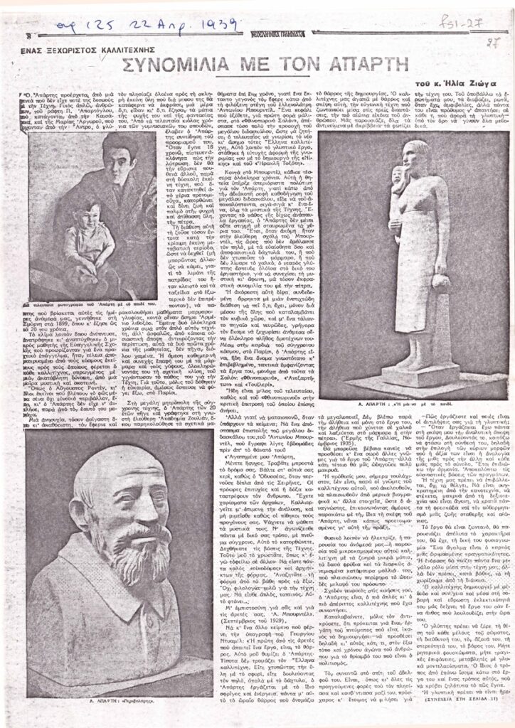 Φωτοαντίγραφο, χαρτί, 2 φφ, 29,5×21εκ, στα ελληνικά, δημοσίευσης άρθρου και αποσπάσματος συνέντευξης του Θανάση Απάρτη.