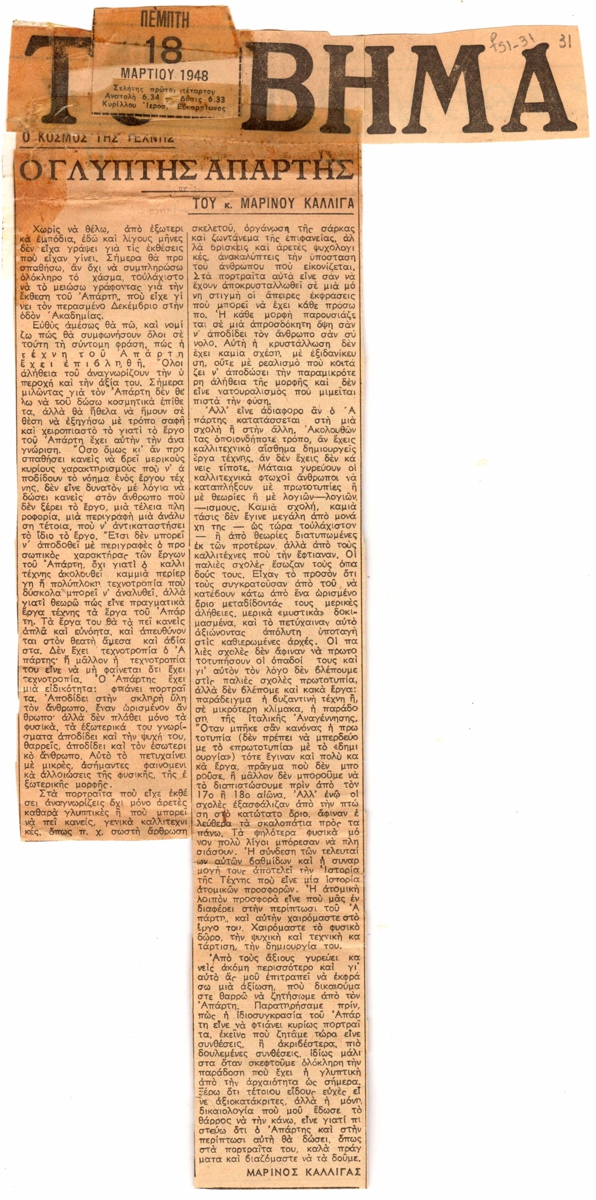 Απόκομμα, χαρτί, 2 φφ ακανόνιστου σχήματος, στα ελληνικά, δημοσίευσης κειμένου για τον Θανάση Απάρτη και το έργο του.
