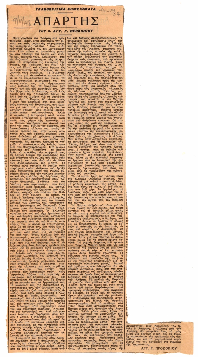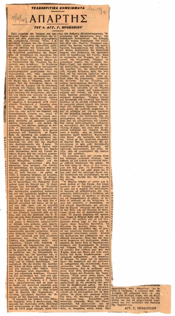 Απόκομμα, χαρτί, 30×16εκ, στα ελληνικά, δημοσίευσης κριτικής για τον Θανάση Απάρτη και το έργο του.