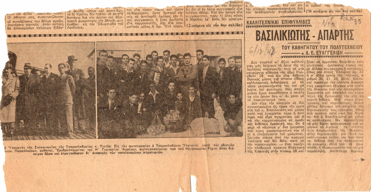 Απόκομμα, χαρτί διπλής όψης, 15×30εκ, στα ελληνικά, δημοσίευσης κριτικής που εντάσσεται στη στήλη “Καλλιτεχνικαί επιφυλλίδες” για τους Αρ. Βασιλικιώτη και Θαν. Απάρτη, με αφορμή εκθέσεις τους.