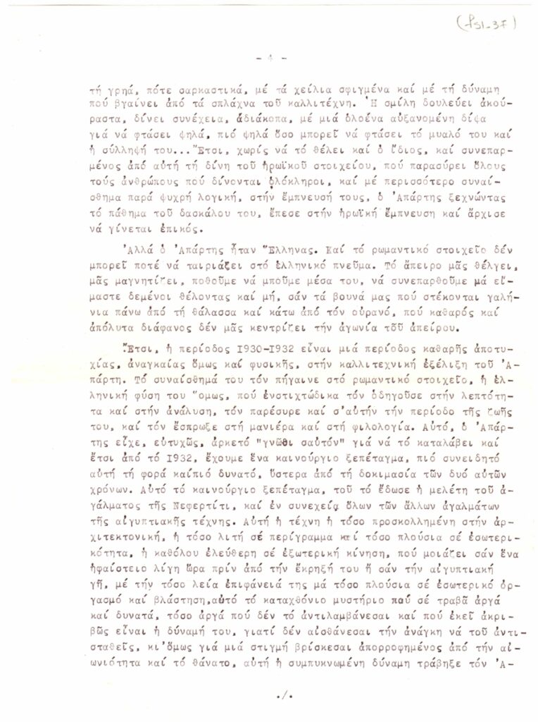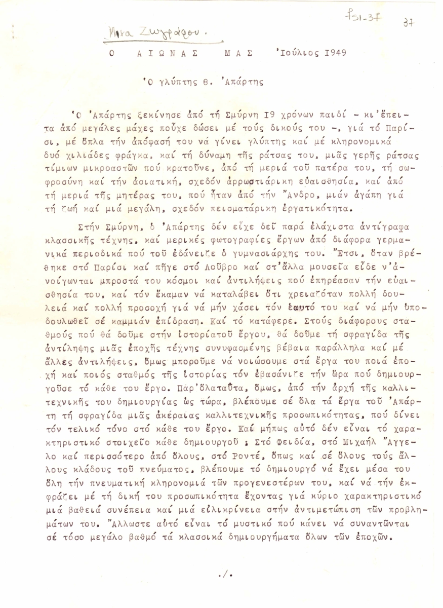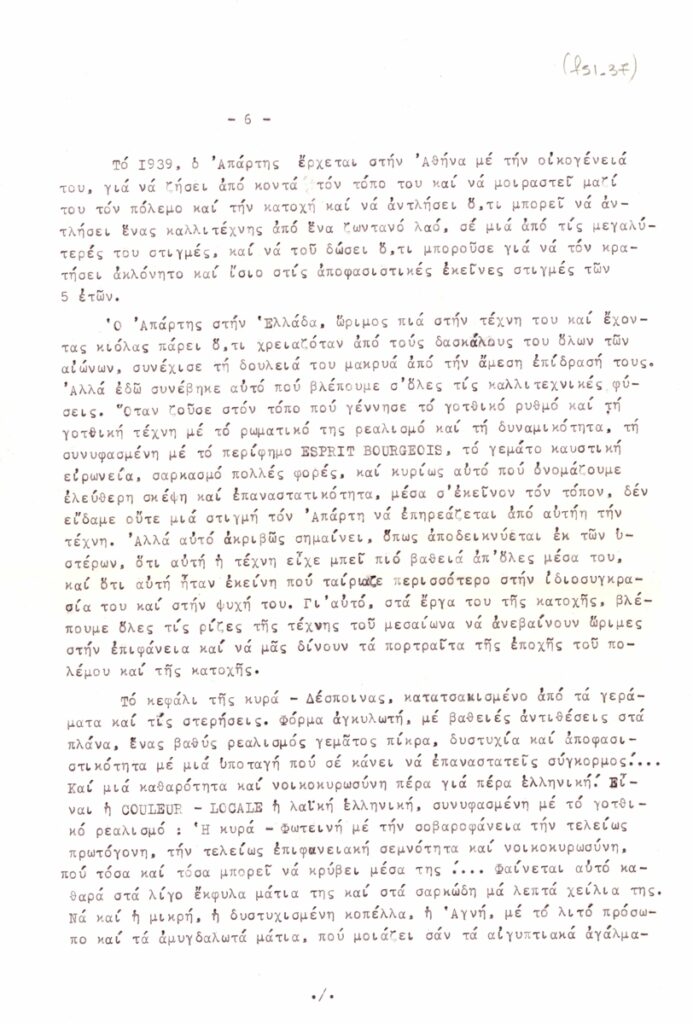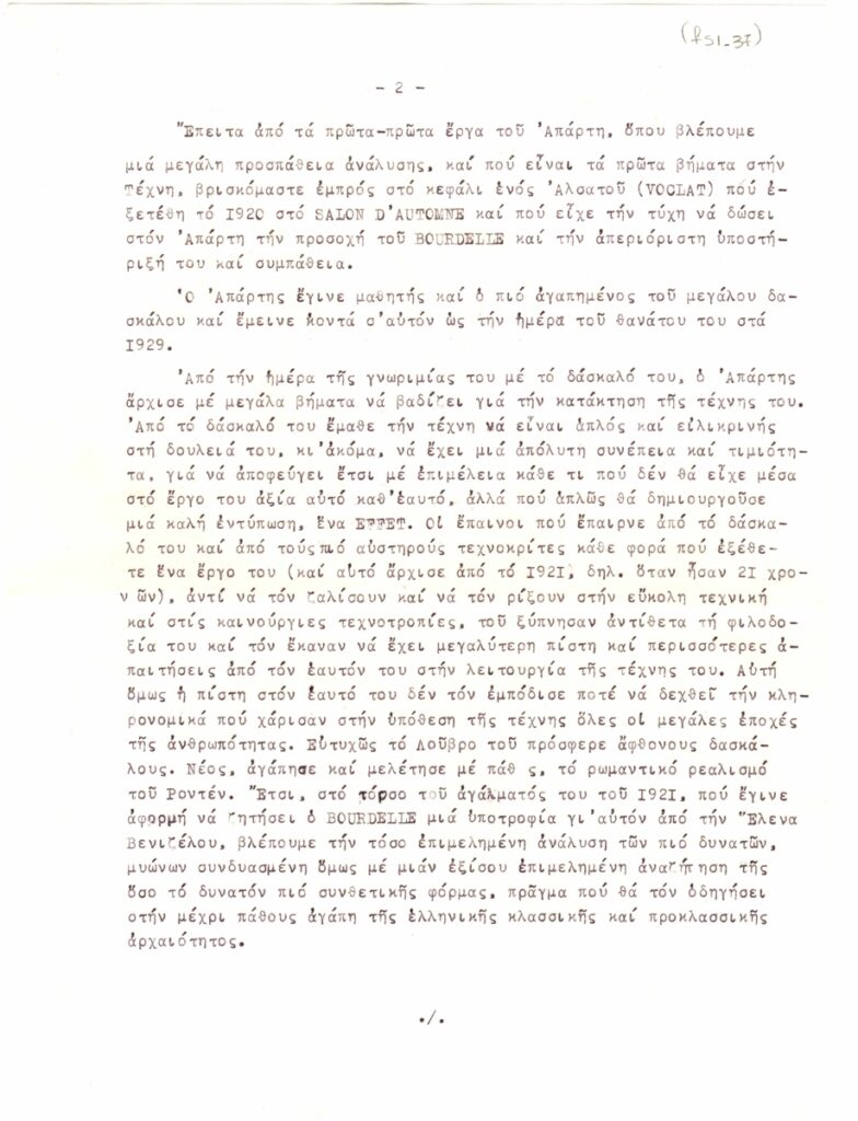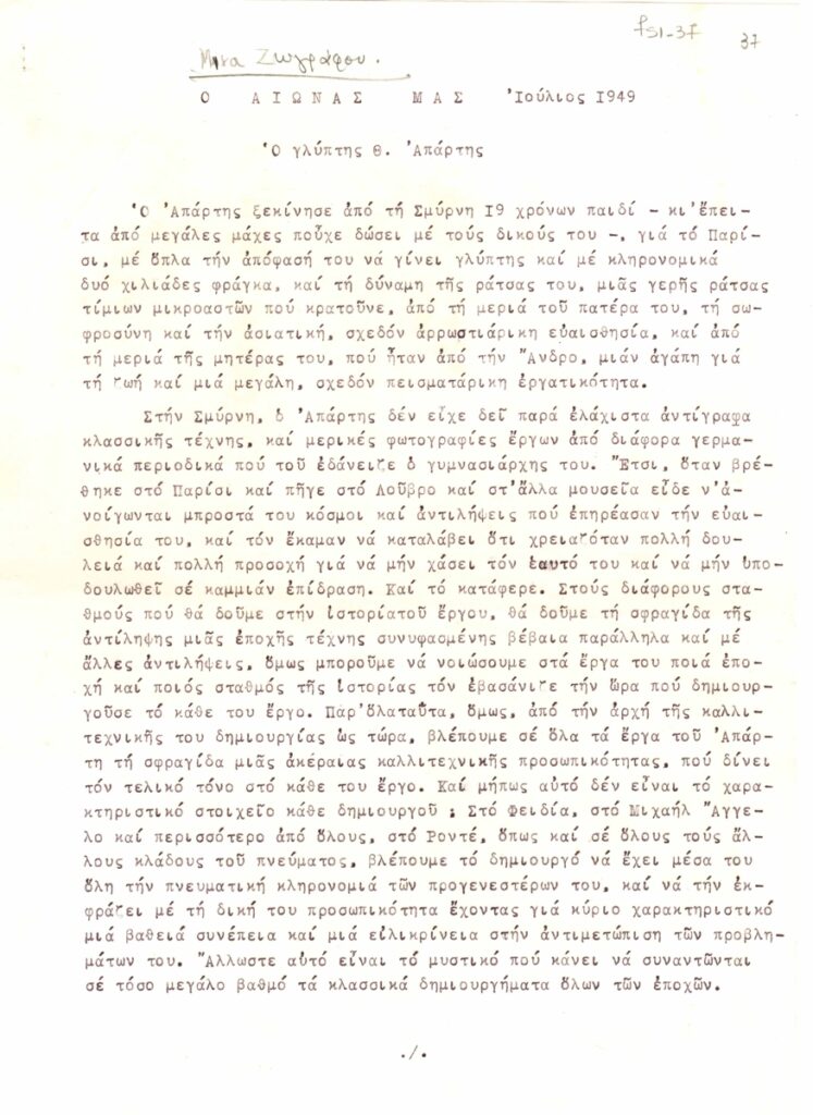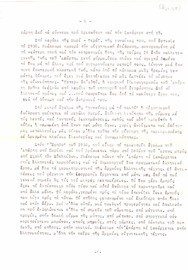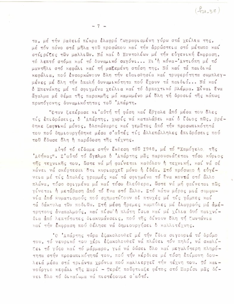 Αποδελτίωση, δακτυλόγραφη, χαρτί, 7 φφ, 29×21εκ, στα ελληνικά, κειμένου για τον Θανάση Απάρτη.