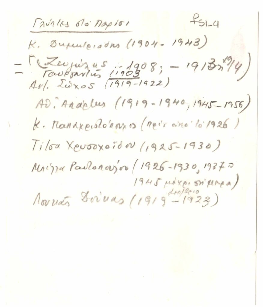 Χειρόγραφο, με μολύβι, χαρτί, 12,5×10,5εκ, στα ελληνικά που περιλαμβάνει λίστα γλυπτών που δραστηριοποιήθηκαν στο Παρίσι με τις αντίστοιχες χρονιές. Ειδικότερα πρόκειται για τους Κ. Δημητριάδη, Γρ. Ζωγώλη, Αντ. Σώχο, Ν. Γεωργαντή, Αθ. Απάρτη, Κ. Παπαχριστόπουλο, Τίτσα Χρυσοχοϊδου, Μπέλλα Ραφτοπούλου, Λουκά Δούκα.
