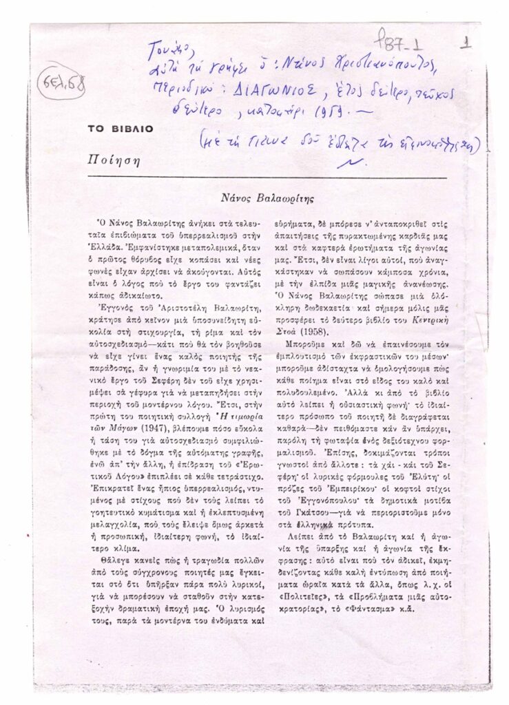 Φωτοαντίγραφο, χαρτί, 21×14,5 εκ., στα ελληνικά, δημοσίευσης άρθρου για τον Νάνο Βαλαωρίτη και το έργο του.