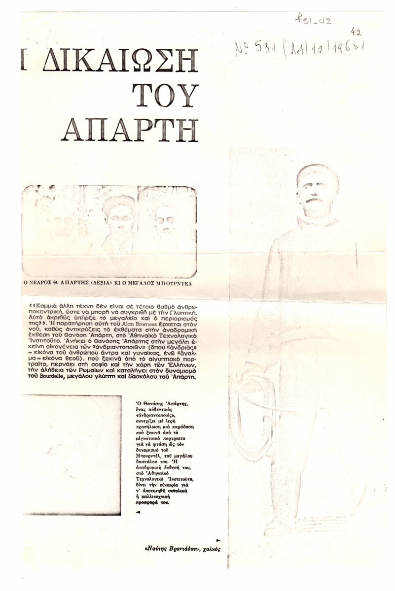 Φωτοαντίγραφο, χαρτί, 2 φφ, 33×21,5εκ, στα ελληνικά, δημοσίευσης άρθρου αφιερωμένου στον Θανάση Απάρτη.