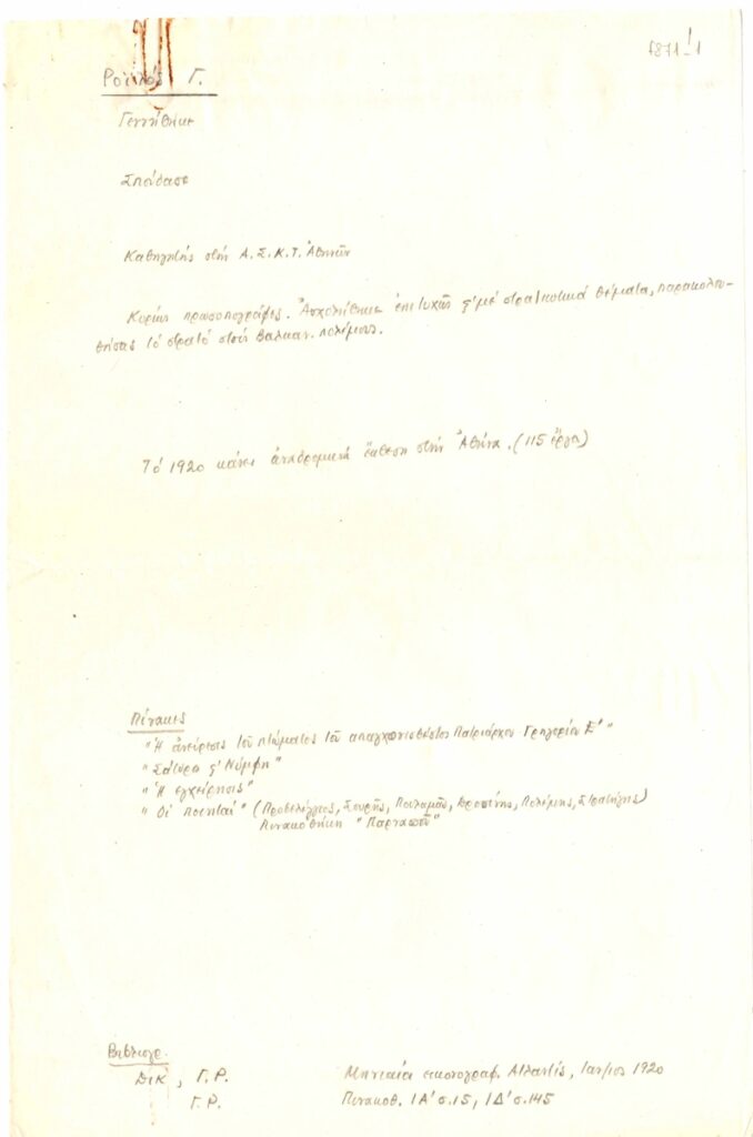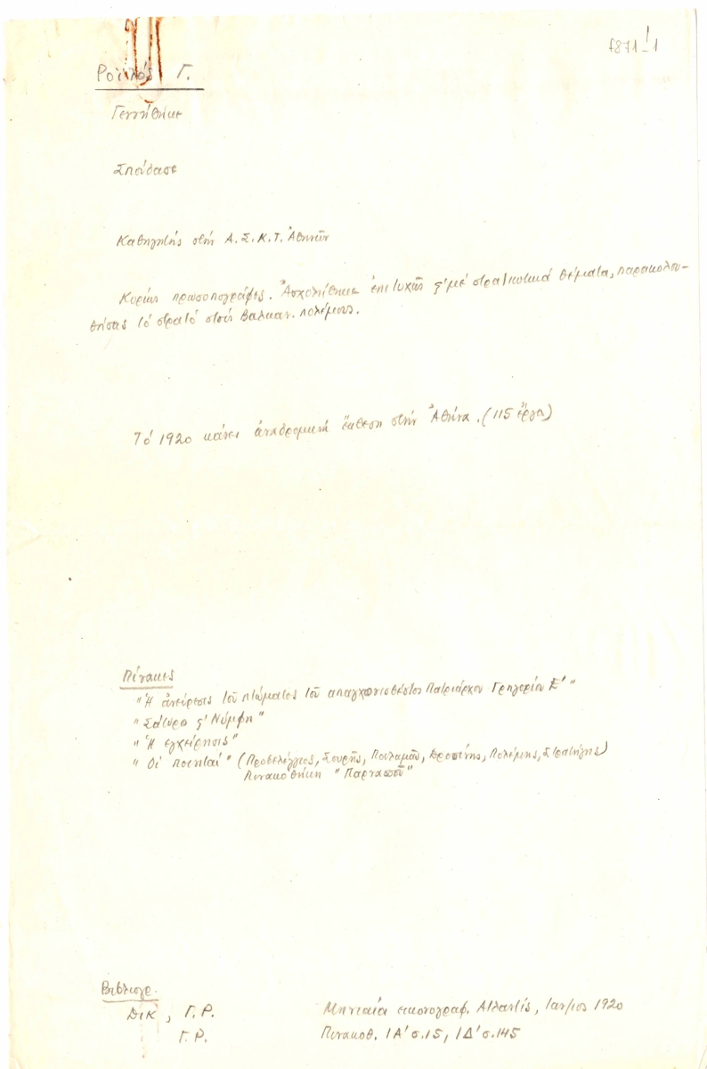 Κείμενο, χειρόγραφο, σε χαρτί, 30×19,5 εκ, με μολύβι, στα ελληνικά, που περιλαμβάνει προσχέδιο βιογραφικού σημειώματος του Γ. Ροϊλού. Αναφέρονται βασικοί πίνακες του καλλιτέχνη και σχετική βιβλιογραφία.