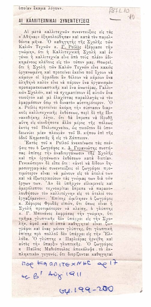 Φωτοαντίγραφο αποκόμματος περιοδικού, 2 φφ, χαρτί, στα ελληνικά, αντίστοιχα 19,5x 8,7 και 8×5,5 εκ., αναφερόμενο στην “Καλλιτεχνική Σχολή”.