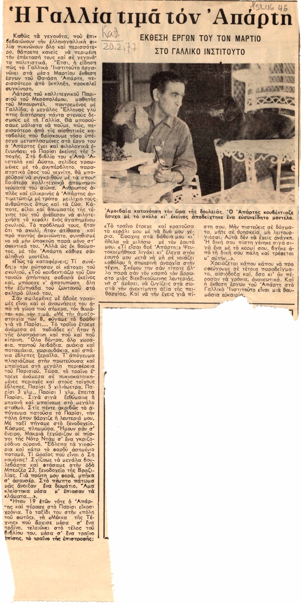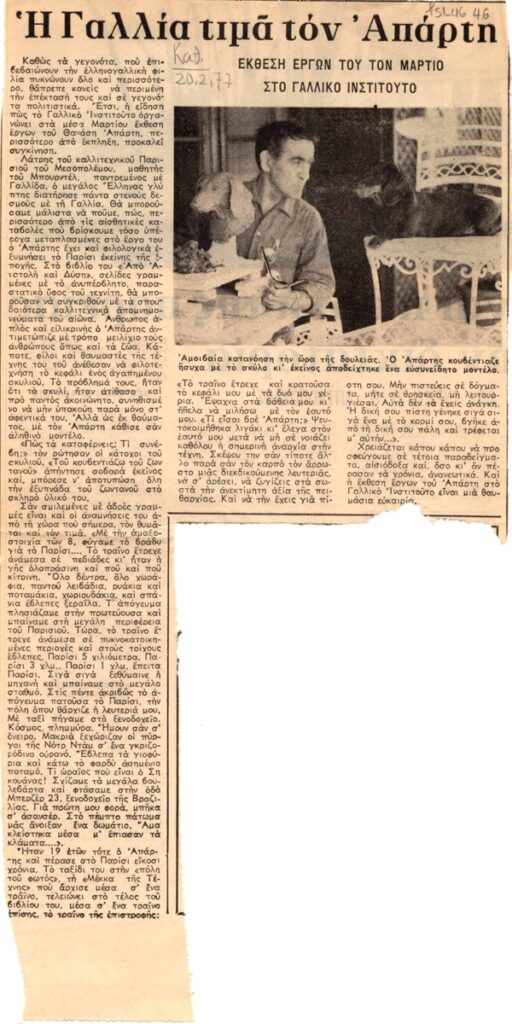 Απόκομμα, χαρτί, 30,5×16εκ, στα ελληνικά, δημοσίευσης κειμένου για τον Θανάση Απάρτη, με αφορμή έκθεσή του στο Γαλλικό Ινστιτούτο.