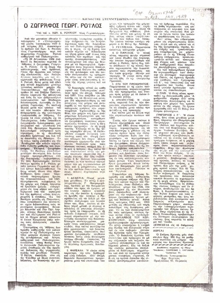 Φωτοαντίγραφο αποκόμματος εντύπου, χαρτί, 33,5×25 εκ, στα ελληνικά που περιλαμβάνει αναδημοσίευση άρθρου σχετικά με τον Γεώργιο Ροϊλό.