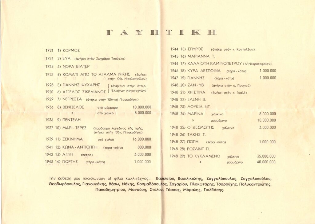 Κατάλογος έκθεσης, χαρτί αναδιπλωμένο, 21,5×15εκ, στα ελληνικά, του Θανάση Απάρτη. Συμπεριλαμβάνονται 29 έργα με χρονολογική σειρά. Επίσης στο εσωτερικό του καταλόγου αναφέρονται καλλιτέχνες που πλαισιώνουν την έκθεση. Ειδικότερα πρόκειται για τους Βασιλείου, Βασιλικιώτη, Ζογγολόπουλο, Ζογγολοπούλου, Θεοδωρόπουλο, Γιαννουκάκη, Βάσω, Νάκης, Κοσμαδόπουλος, Ζαχαρίου, Πλακωτάρης, Τσαρούχης, Πολυκαντριώτης, Παπαδημητρίου, Μανούση, Στυλου, Τάσσος, Μόραλης, Γιολδάσης.