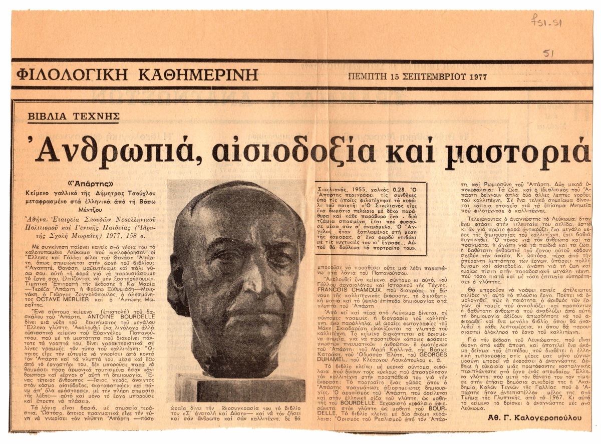 Απόκομμα, χαρτί, 21,5×29εκ, στα ελληνικά, δημοσίευσης άρθρου αναφερόμενου στο γαλλικό βιβλίο της Δήμητρας Τσούχλου για τον Θανάση Απάρτη. Το άρθρο εντάσσεται στη στήλη ‘Βιβλία Τέχνης’.
