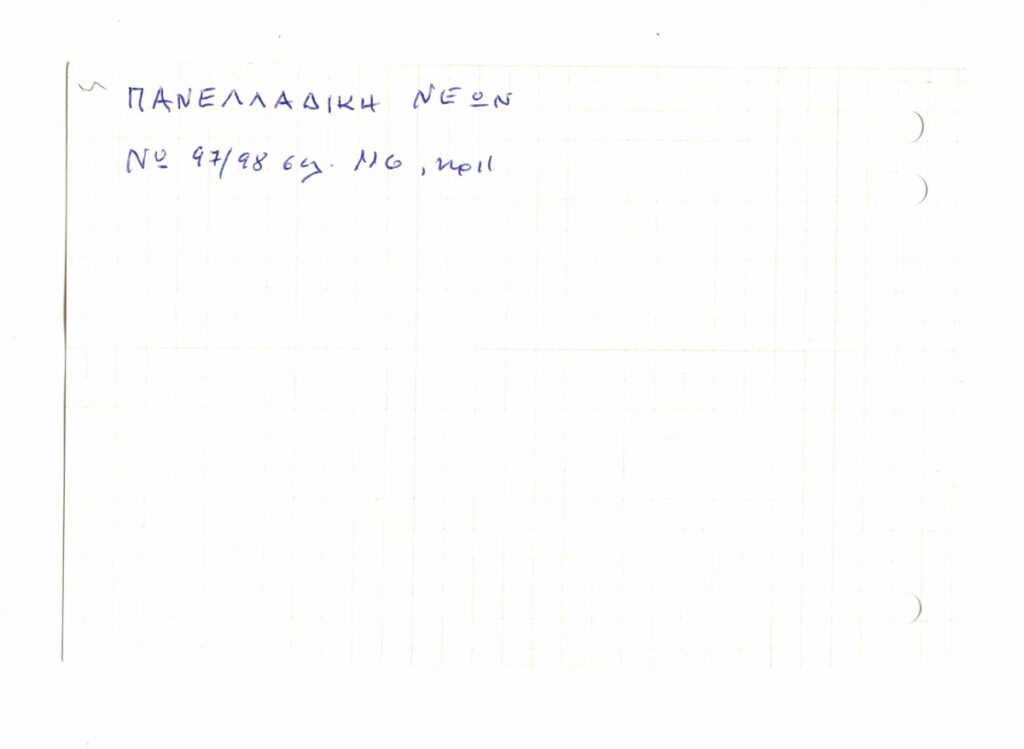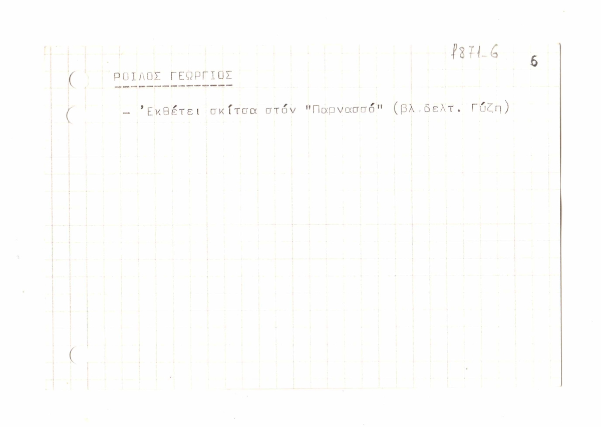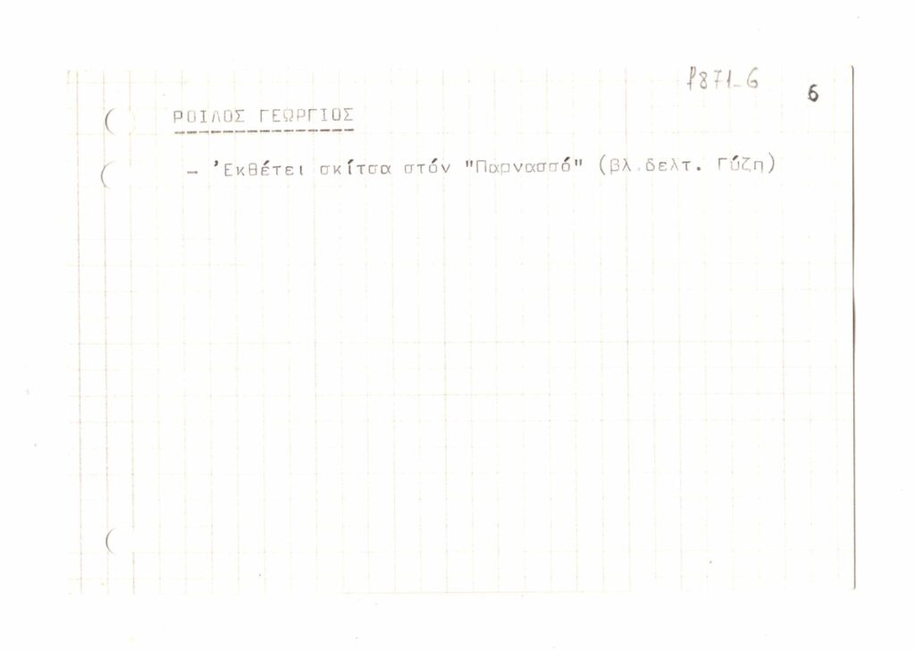 Κείμενο σε μορφή σημειώσεων, σε χαρτόνι, 10×15εκ, στα ελληνικά σχετικά με τον Γεώργιο Ροϊλό. Γίνεται αναφορά στο φιλολογικό περιοδικό “Παρνασσός” και στο έντυπο “Πανελλαδική Νέων”.