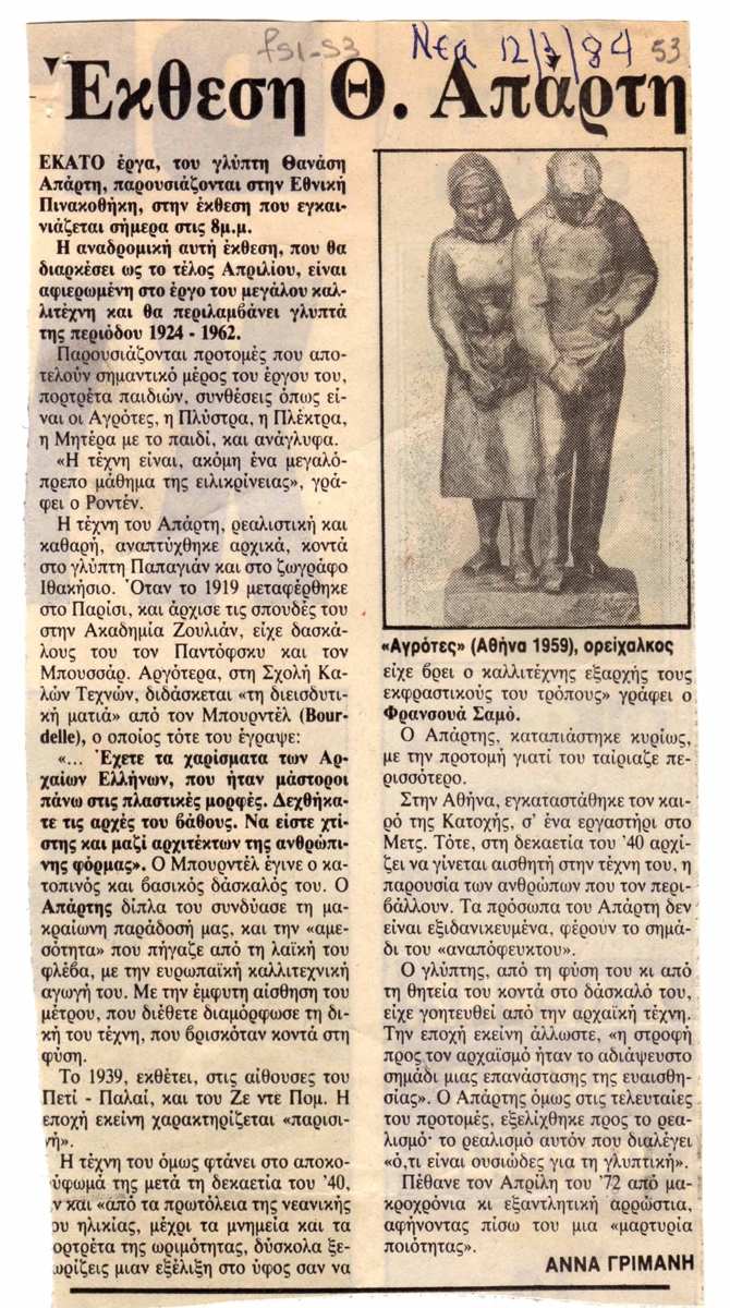 Απόκομμα, χαρτί, 19×10εκ, στα ελληνικά, δημοσίευσης κειμένου για τον Θανάση Απάρτη, με αφορμή έκθεση για το έργο του στην Εθνική Πινακοθήκη.