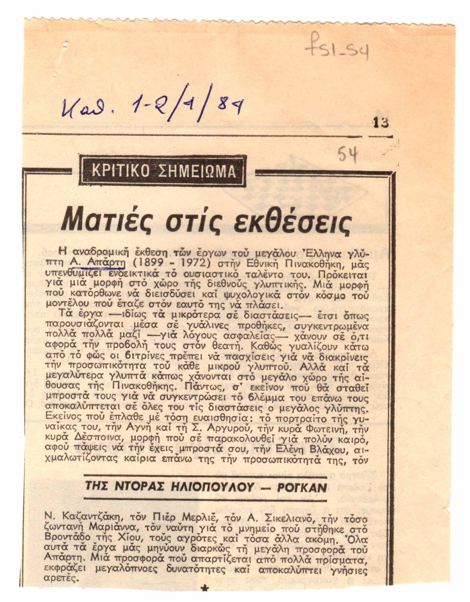 Απόκομμα (01-02/04/1984), χαρτί, 15×11εκ, στα ελληνικά, δημοσίευσης κριτικής για την αναδρομική έκθεση του Θανάση Απάρτη στην Εθνική Πινακοθήκη. Το κείμενο εντάσσεται στη στήλη “Κριτικό Σημείωμα”.