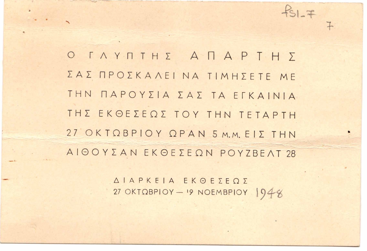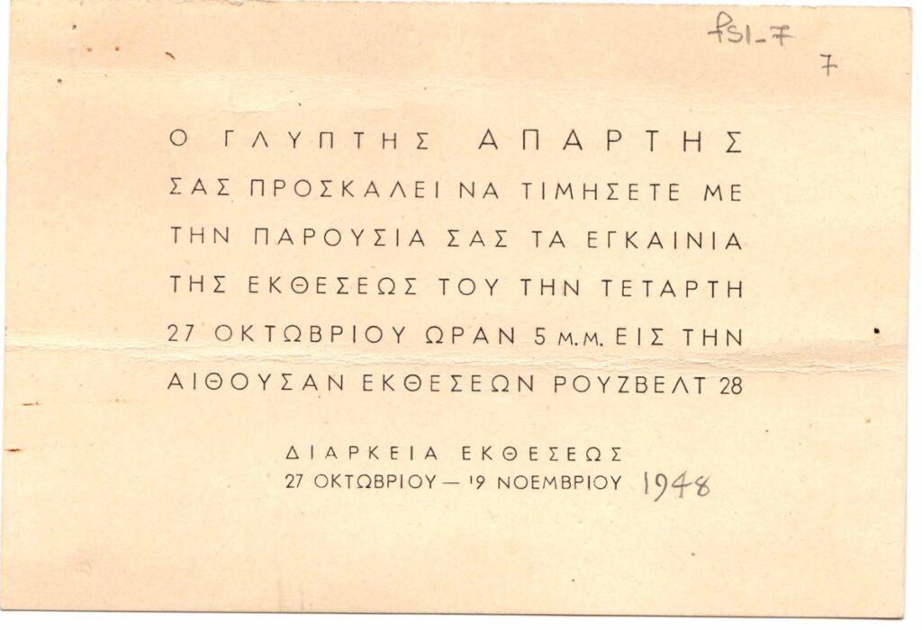 Πρόσκληση εγκαινίων έκθεσης του Θανάση Απάρτη, χαρτόνι, 10×14εκ, στα ελληνικά.