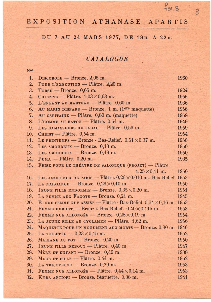 Κατάλογος έκθεσης, χαρτί διπλής όψεως, 21,5×15εκ, στα γαλλικά, του Θανάση Απάρτη.