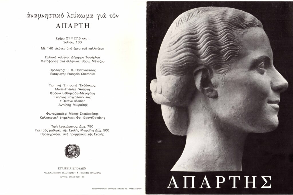 Έντυπο, χαρτόνι αναδιπλωμένο, στα ελληνικά, 26×20εκ, για τον Θανάση Απάρτη. Πρόκειται για ενημερωτικό έντυπο σχετικά με την έκδοση αναμνηστικού λευκώματος για τον γλύπτη. Συμπεριλαμβάνει εικονογράφηση.