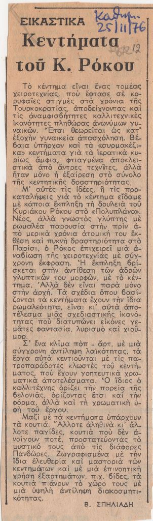 Απόκομμα, χαρτί, 19×5.5 εκ., στα ελληνικά, δημοσίευσης κριτικής έκθεσης του Κυριάκου Ρόκου. Γίνεται λόγος για τα κεντήματα που φιλοτέχνησε ο καλλιτέχνης και που παρουσιάζει σε έκθεσή του στην Αθήνα.