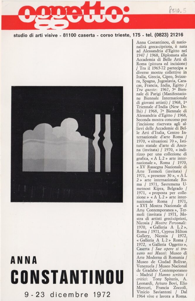 Πρόσκληση, χαρτόνι διπλής όψεως, 22×14 εκ., στα ιταλικά, εγκαινίων ατομικής έκθεσης της Άννας Κωνσταντίνου Wilson.