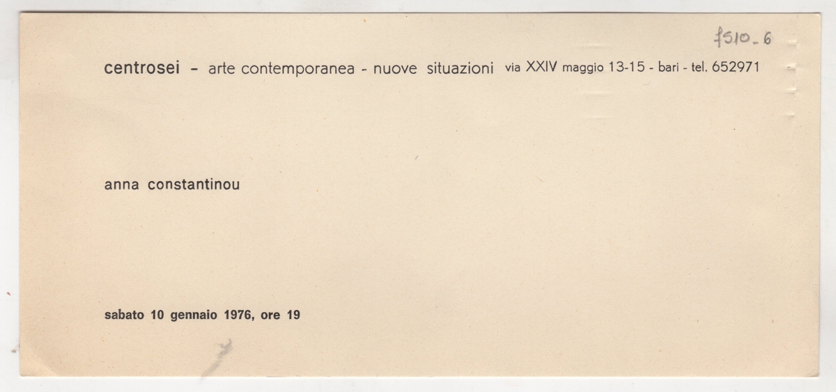 Πρόσκληση, χαρτόνι, 10×22 εκ., στα ιταλικά, εγκαινίων έκθεσης της Άννας Κωνσταντίνου Wilson, στην Ιταλία.