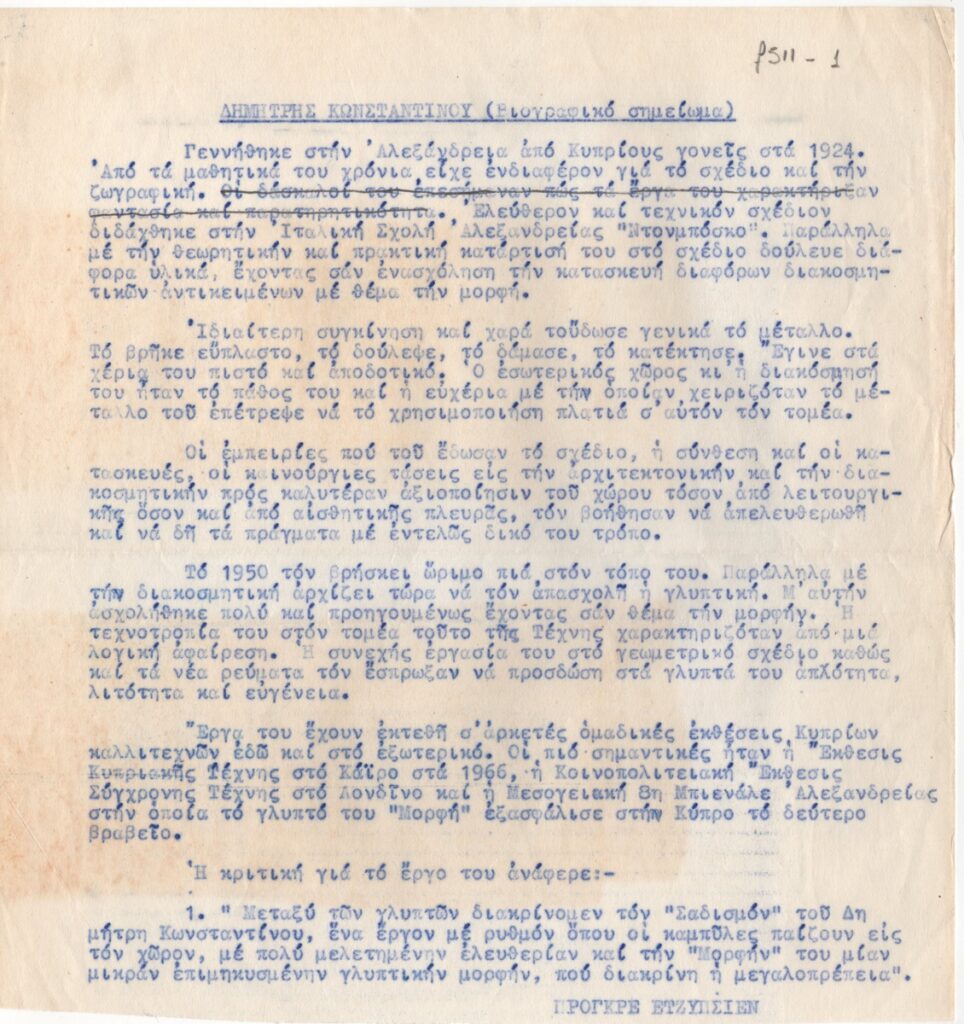 Κείμενο, δακτυλόγραφο, αντίγραφο μπλε καρμπόν, με διορθώσεις, χειρόγραφες, με μολύβι, στα ελληνικά, χαρτί, 21,5×20,3 εκ. Γίνεται αναφορά στις σπουδές και την καλλιτεχνική πορεία του καλλιτέχνη μέχρι το 1970.