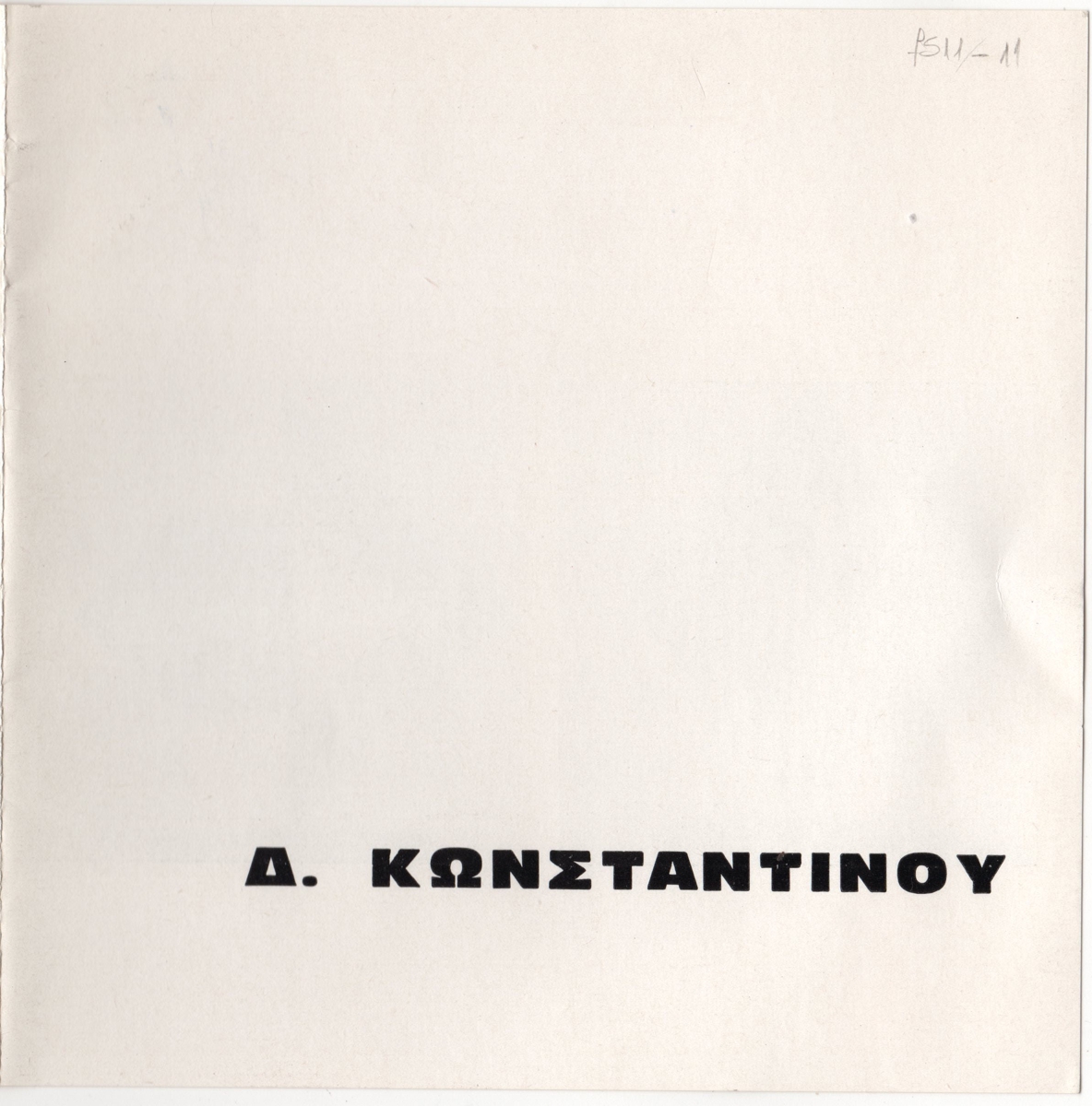 Έντυπο έκθεσης, τρίπτυχο, ιλουστρασιόν χαρτί, στα ελληνικά, 15,2×15,0 εκ. Αφορά την ατομική έκθεση γλυπτικής του Δημήτρη Κωνσταντίνου στην Αθήνα το 1975. Περιέχει κατάλογο ατομικών και ομαδικών εκθέσεων. Εικονογραφείται με αναπαραγωγή φωτογραφίας του καλλιτέχνη και αναπαραγωγές έργων.