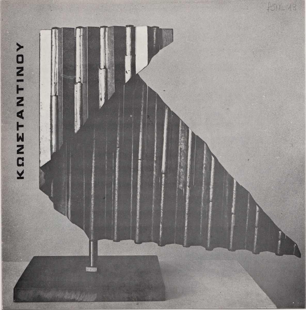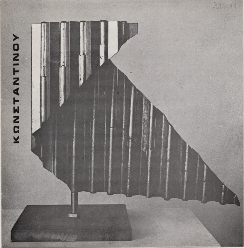 Έντυπο έκθεσης, δίπτυχο, στα ελληνικά, ιλουστρασιόν χαρτί, 19,8×19,4 εκ. Αφορά την ατομική έκθεση γλυπτικής του Δημήτρη Κωνσταντίνου στη Θεσσαλονίκη το 1975. Περιέχει κείμενο για τον καλλιτέχνη της Έφης Φερεντίνου και βιογραφικό καλλιτέχνη. Εικονογραφείται με αναπαραγωγή φωτογραφίας του καλλιτέχνη στο ατελιέ του και αναπαραγωγή έργου.