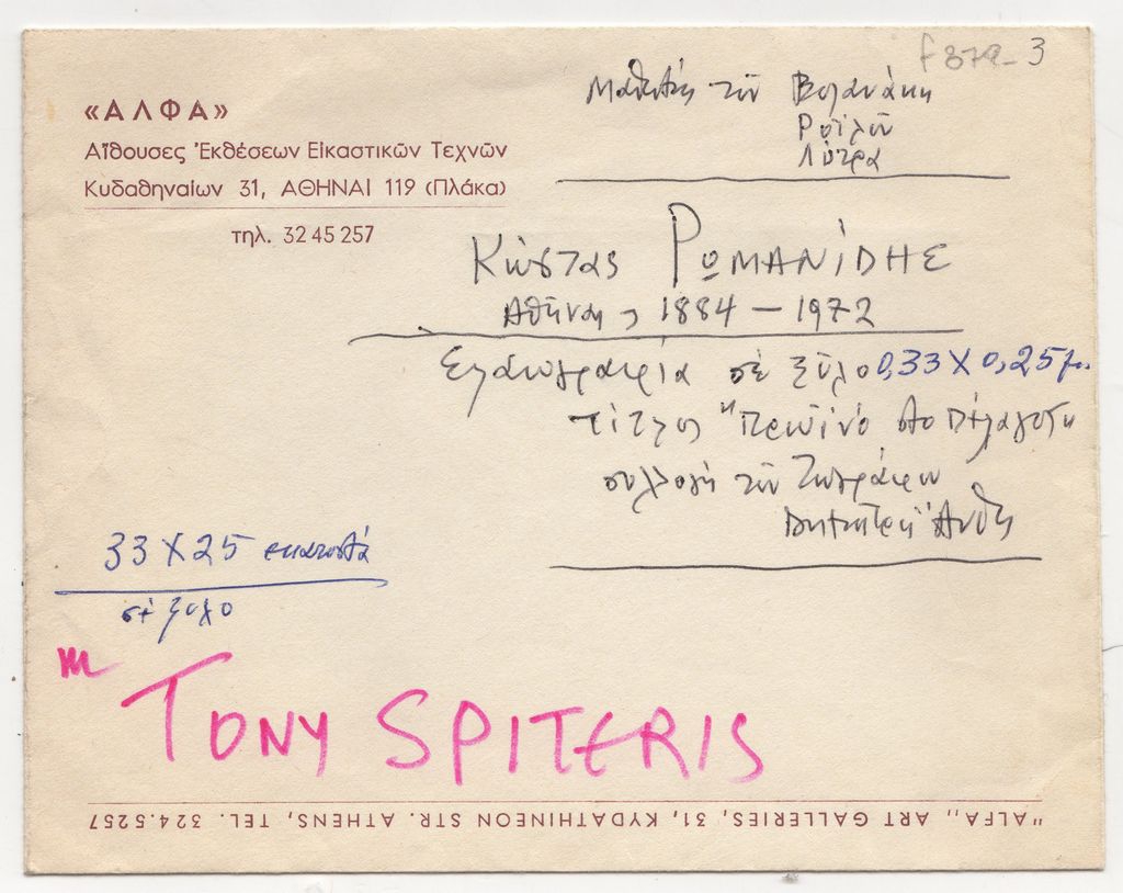 Φάκελος, χαρτί, 13.5×17 εκ., με χειρόγραφες σημειώσεις, στα ελληνικά, πληροφοριών για τον Κώστα Ρωμανίδη. Αναγράφονται βιογραφικά στοιχεία και πληροφορίες για έργο του.