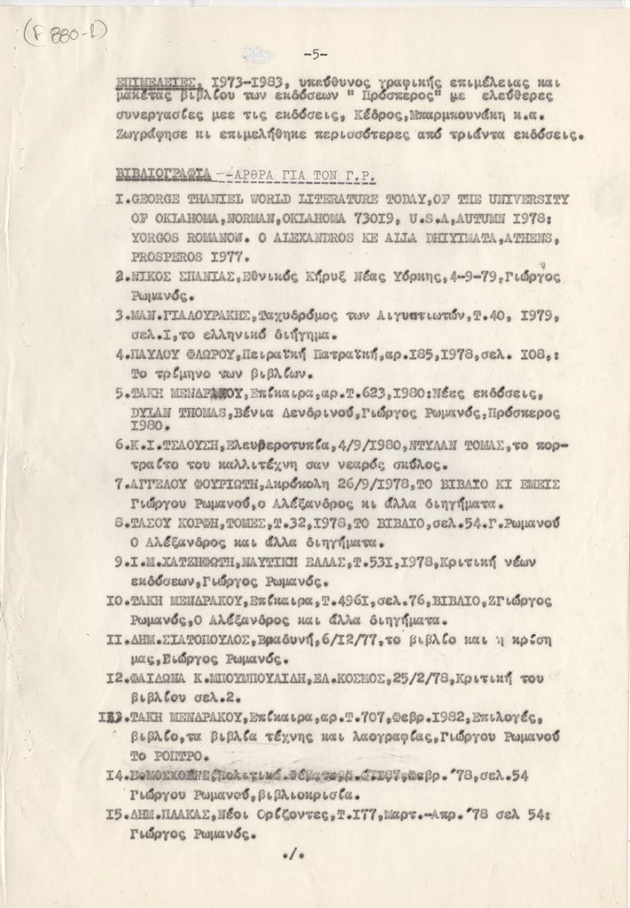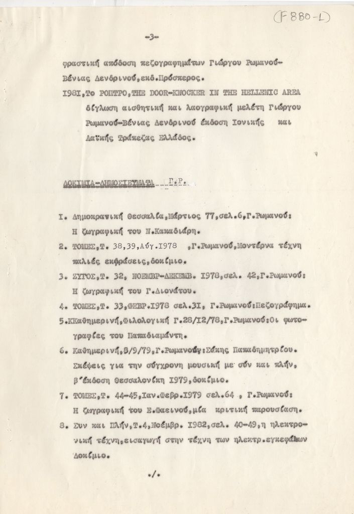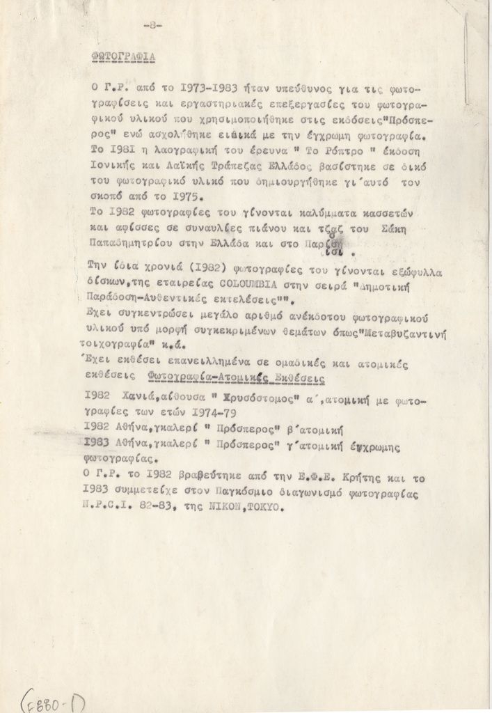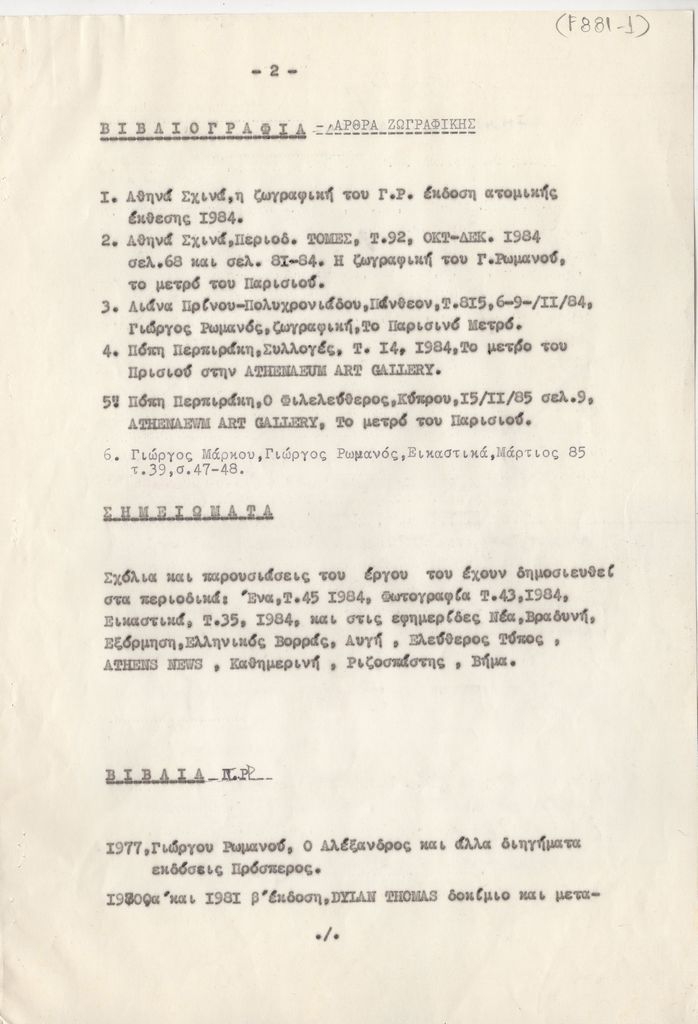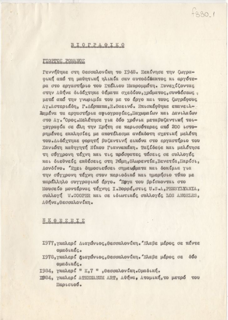 Κείμενο, δακτυλόγραφο, χαρτί, 29,5×21 εκ., 9 φύλλα, στα ελληνικά. Αναλυτικό βιογραφικό σημείωμα του Γιώργου Ρωμανού. Περιέχει λίστα εκθέσεων του καλλιτέχνη, αναλυτική βιβλιογραφία, ραδιοφωνικές εκπομπές στις οποίες παρουσιάστηκε. Ακόμη, γίνεται λόγος για την ενασχόλησή του με την φωτογραφία και την επαγγελματική του δραστηριότητα.