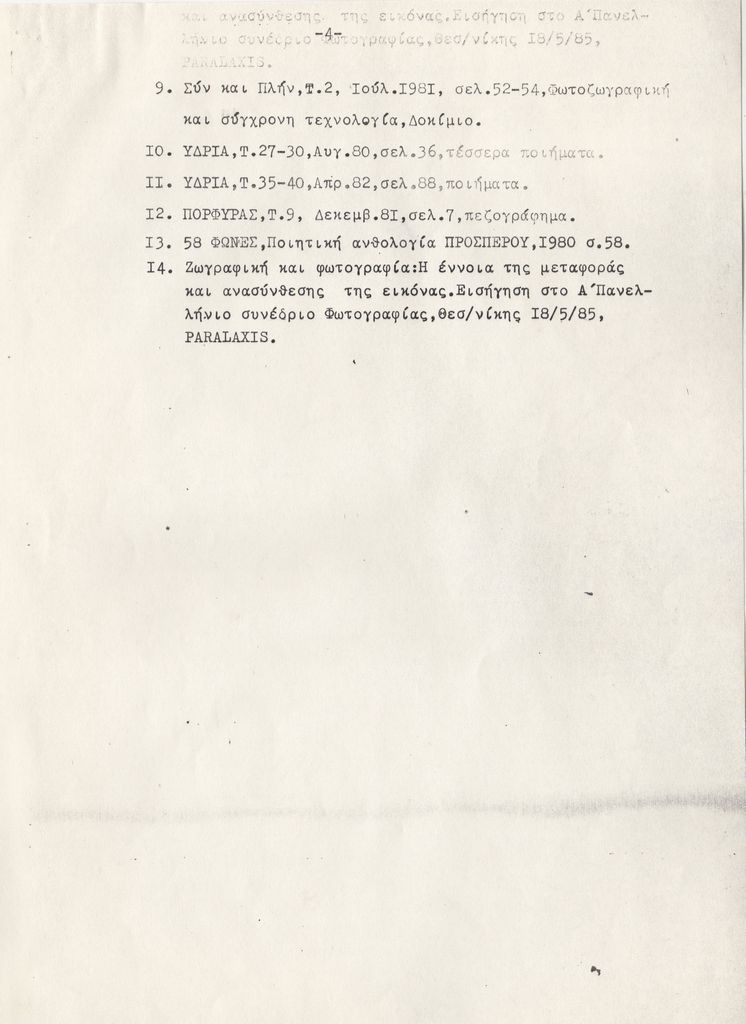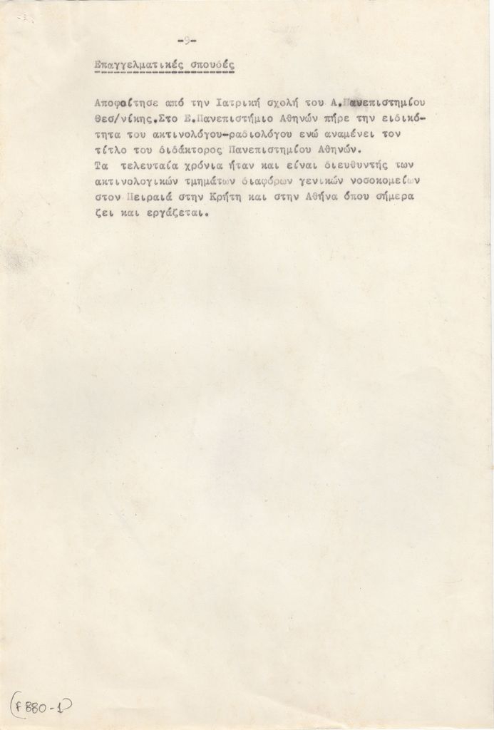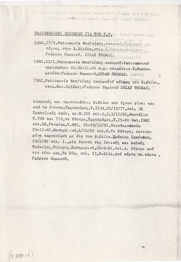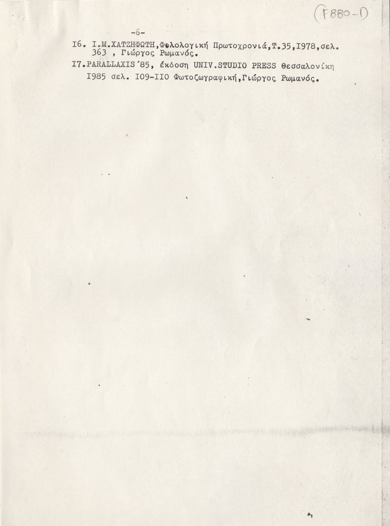 Κείμενο, δακτυλόγραφο, χαρτί, 29,5×21 εκ., 9 φύλλα, στα ελληνικά. Αναλυτικό βιογραφικό σημείωμα του Γιώργου Ρωμανού. Περιέχει λίστα εκθέσεων του καλλιτέχνη, αναλυτική βιβλιογραφία, ραδιοφωνικές εκπομπές στις οποίες παρουσιάστηκε. Ακόμη, γίνεται λόγος για την ενασχόλησή του με την φωτογραφία και την επαγγελματική του δραστηριότητα.
